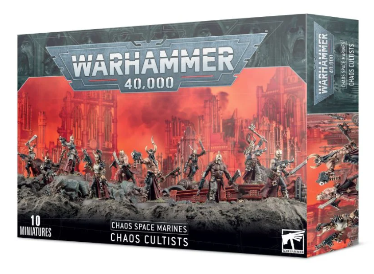 Chaos Cultists are the mortal devotees of the Dark Gods, ordinary men and women fallen to promises of temporal power. Under the command of mighty heretic warlords, such fanatics take to the field in huge Cultist Mobs. This blasphemous militia charges headlong into battle with a motley collection of improvised, stolen and makeshift weapons, overwhelming even determined enemies through sheer weight of numbers.