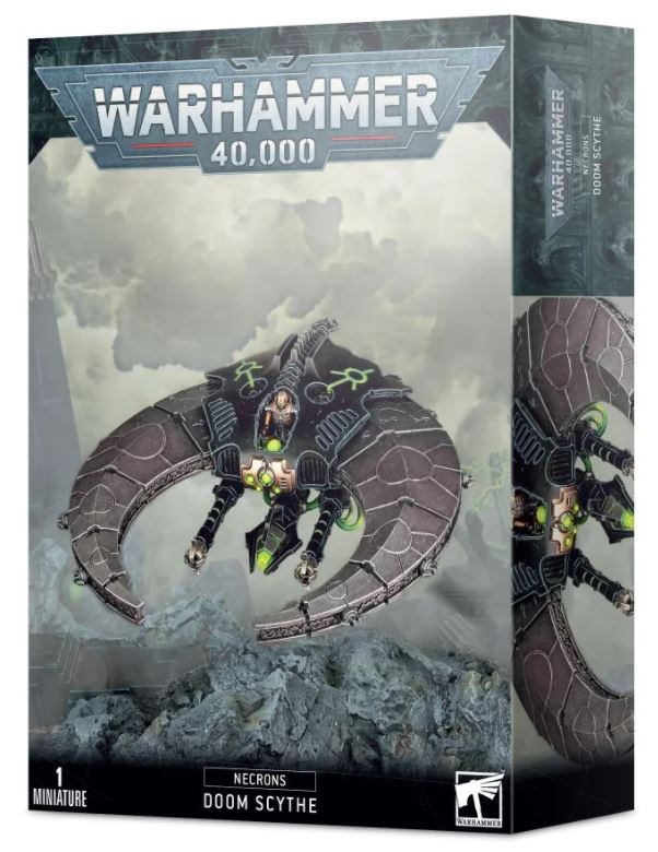 This multi-part plastic kit contains 51 components, a flying stem, large oval base, and a Necron transfer sheet with which to build a Night Scythe. This kit can be used optionally to build a Doom Scythe.
