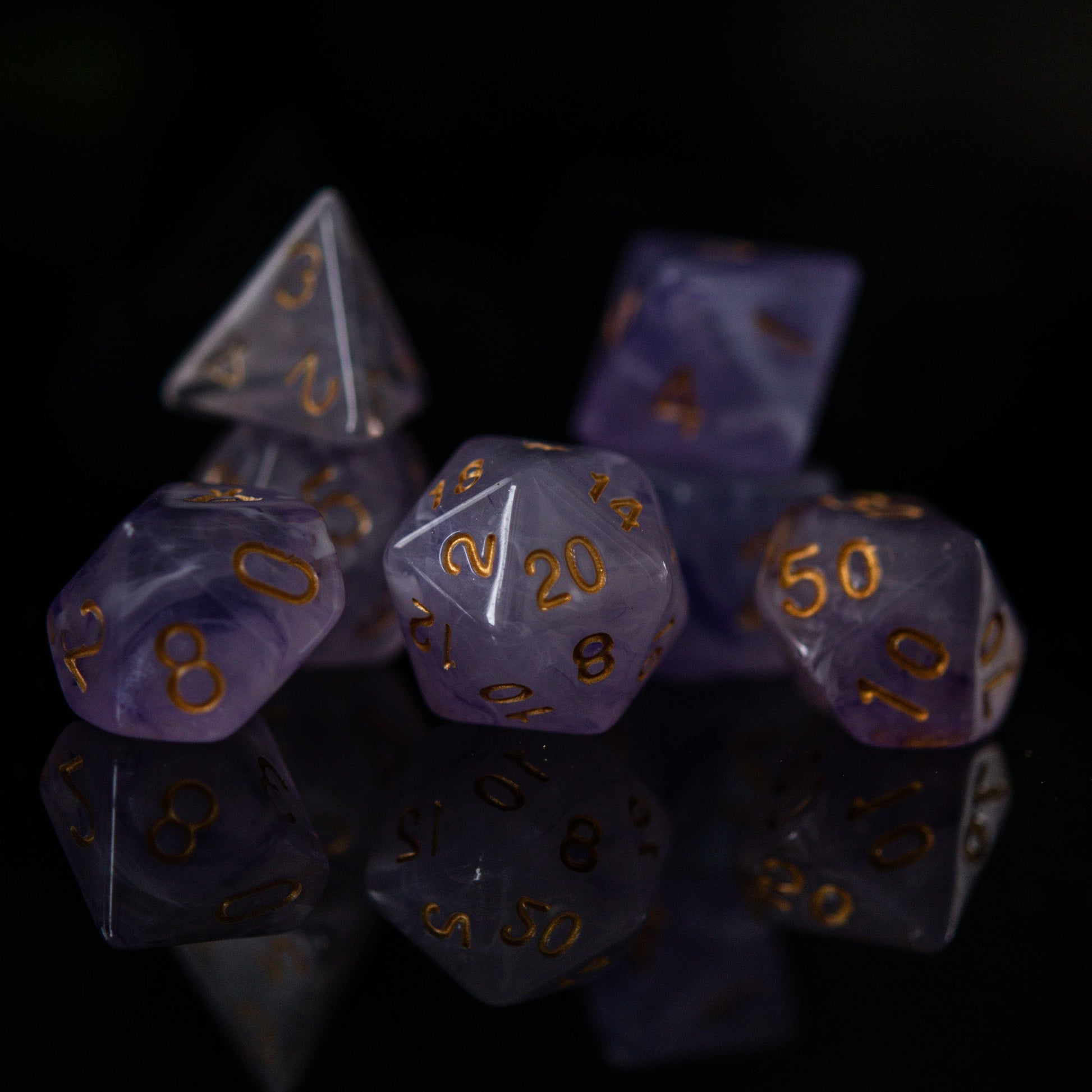 Our acrylic dice are carefully poured into individual molds and cured inside a vacuum chamber to insure no air bubbles are trapped inside the dice. After curing, each individual die is removed from the mold and numbers are painted by hand. These dice are perfect for any RPG and will sure to impress at your upcoming session!