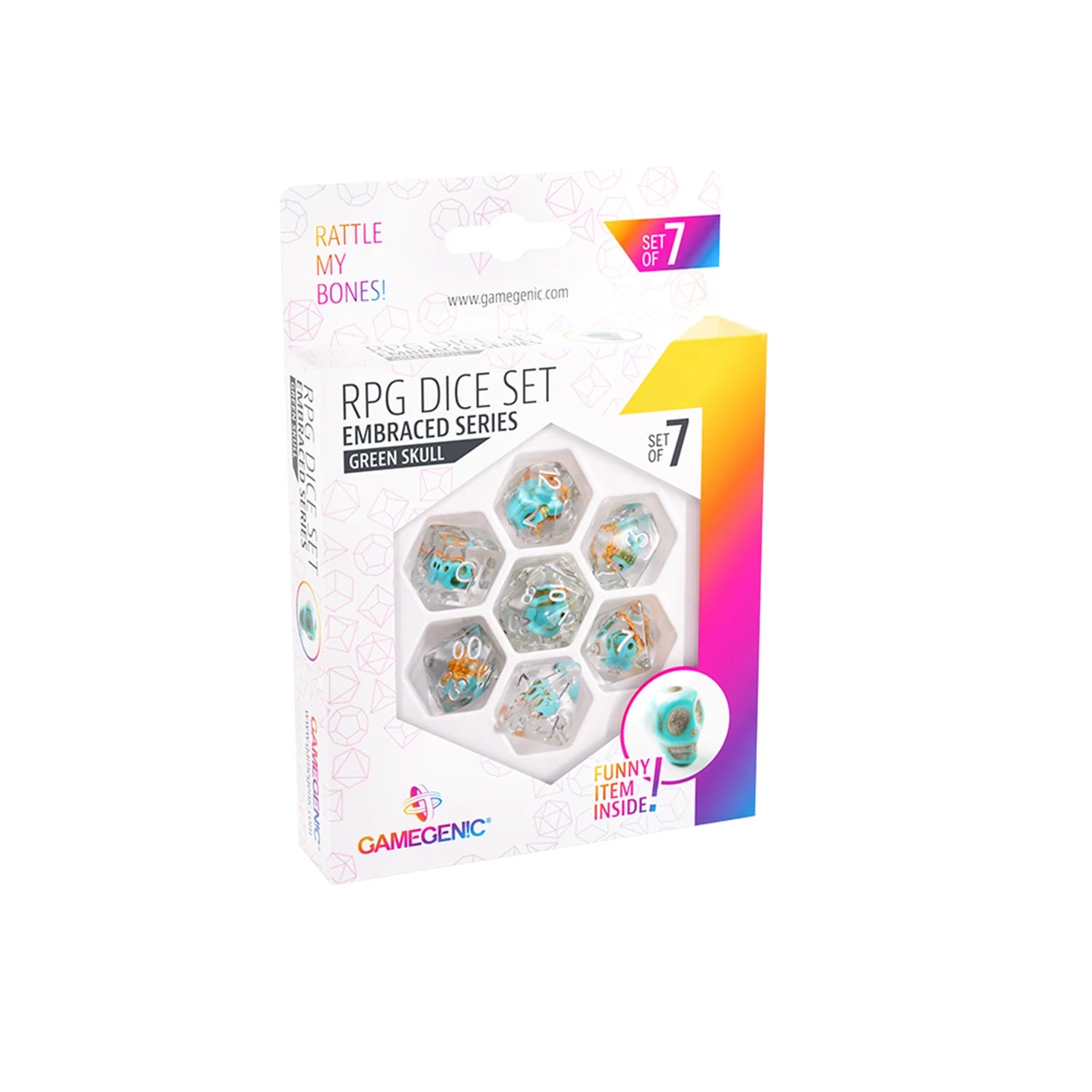 Choose your weapon! This dice set contains a D4, a D6, a D8, two D10 (10 and 00), a D12 and a D20. All dice are round-cornered and manufactured at a premium level. The Embraced Dice have an interesting item inside the cube and will make your game night a critical hit. They are packed in a window cardboard box that displays all dice at the front.
