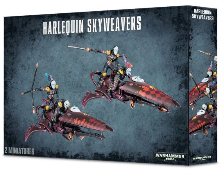 This multi-part plastic kit contains 84 components with which to make a 2 Harlequin Skyweavers. Also included are 2 large flying bases and a Harlequins transfer sheet.