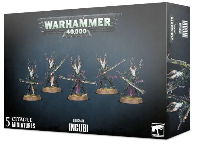 This kit is supplied in 68 plastic components and comes with 5 28.5mm Citadel round bases and a 25mm round base. It builds either 5 Incubi or 4 Incubi and a Klaivex. The Klaivex can be assembled either with a pair of joined demiklaives or separated demiklaives and also has a choice of two heads. The kit also includes a single-piece Drukari symbol that could optionally be used as an objective marker.