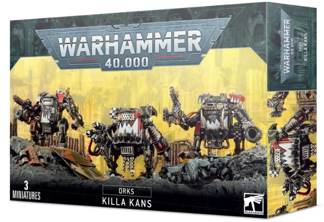 This box set contains three multi-part plastic Ork Killa Kans. This 94-piece set includes: three variations of Cockpit, three different close combat weapons, a big shoota, a rokkit launcha and a skorcha. Also included are a host of glyphs, armour plates, horns, metal teef and dangly bitz. Models supplied with 60mm round bases.