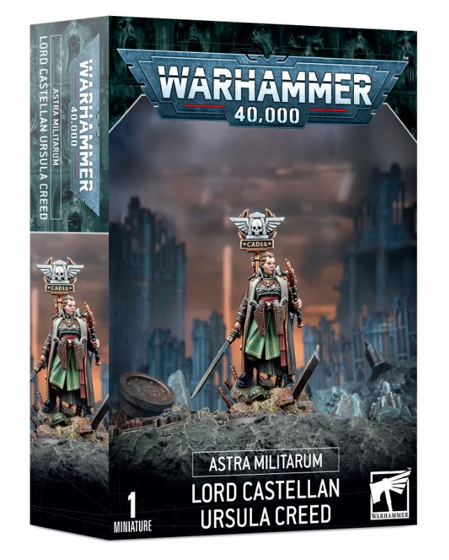 This kit builds Lord Castellan Ursula Creed, an indomitable commandant of the Astra Militarum. Stood atop the rubble of a ruined Imperial world, Ursula strikes an imposing figure with her father's iconic greatcoat slung over her shoulders, an icon of Cadia raised behind her. Twin relic pistols, Duty and Vengeance, are strapped about her waist, and she wields an unsheathed power sword in one hand. In the other, she carries either a pair of magnoculars for surveying the battlefield, or a bejewelled sceptre of her high office. The kit also includes a choice of two heads – one helmeted, and the other bare. Ursula Creed is not only the highest ranking officer of Cadia, but a potent symbol of courage and tenacity, and an ideal centrepiece for any Cadian collection.