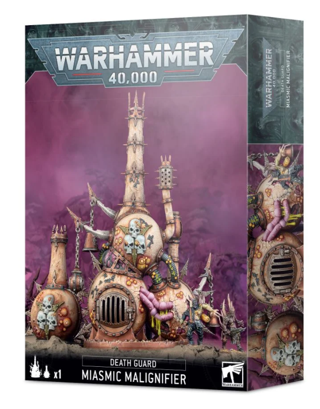 This 55-piece plastic kit makes one Miasmic Malignifier, a Death Guard-specific piece of terrain for use in games of Warhammer 40,000.