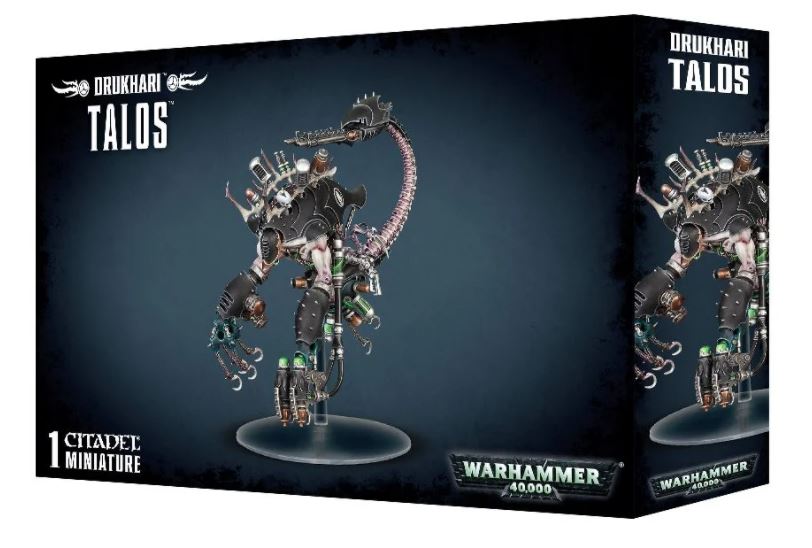 This multi-part plastic kit contains 89 components with which to make one Drukhari Talos Pain Engine or one Cronos Parasite Engine. The box includes all manner of features: chain-flails, ichor injectors, a liquefier gun and many syringes, as well as several variant heads and arms.