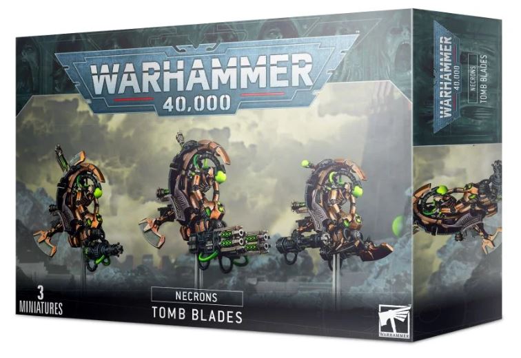 This multi-part plastic boxed set contains 162 components with which to build three Necron Tomb Blades. This set comes with 2 small flying stems, 2 long flying stems, 3 small flying bases and 2 Necron transfer sheets.