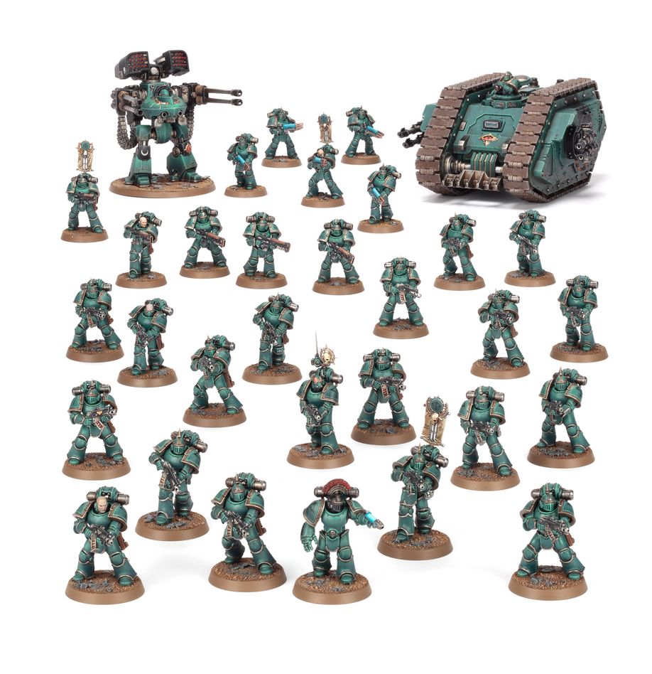 This multipart plastic kit contains 927 plastic components, and is supplied with 30x Citadel 32mm Round Bases, 1x Citadel 80mm Round Base, two Legiones Astartes Infantry Transfer Sheets, each containing 293 transfers, and two Legiones Astartes Vehicle Transfer Sheets, each containing 44 transfers.